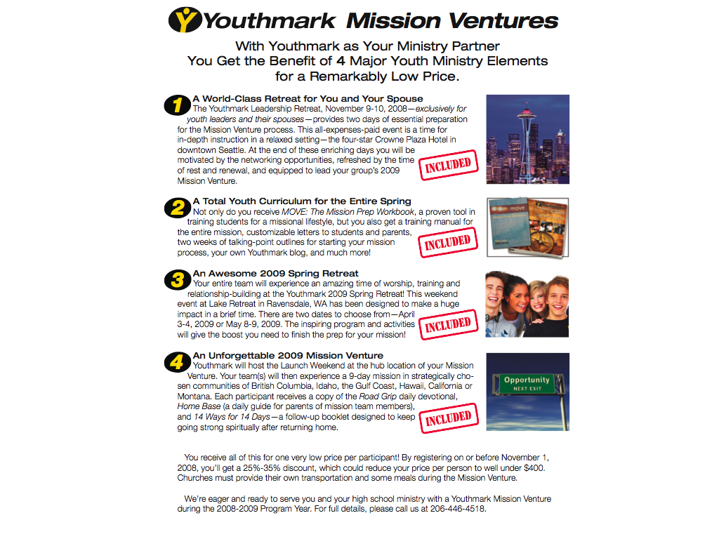 I am officially one week into the marketing of the Youthmark Mission Ventures.  I have met with three networks of youth pastors and had three other individual meetings with youth pastors.  In the next week I will have the opportunity with a couple more networks and a few more individuals.  So far, I am hearing a lot of excitement and have groups signing up!