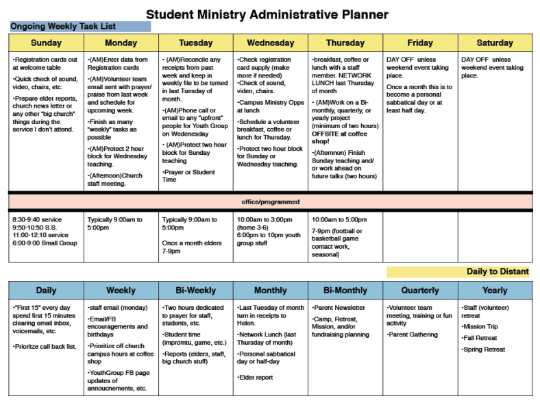 - Be realistic… I have friends who love to study the Word. In fact, I love to study the Word. But the reality is, I couldn’t be effective at being a Youth Pastor if I was spending 10-12 hours on each talk. I typically had 2 or 3 messages each week (not including the semi-regularly scheduled preaching in “Big Church”). I would have had to neglect other areas of ministry–namely shepherding people– if I were to spend that much time on each talk. The same could be said for other areas, not just messages. So, be realistic about how much time you actually need to spend on emails, financial matters and messages.